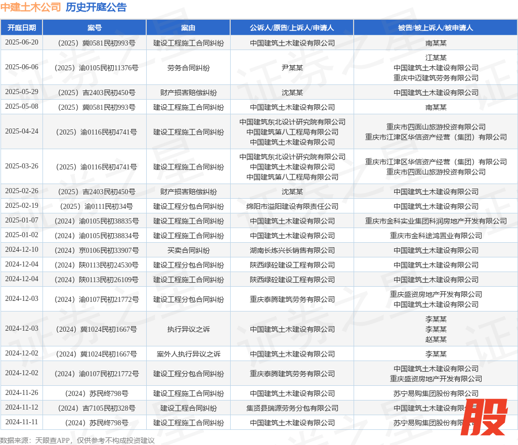 案号:(2025)冀0581民初993号审理法院:南宫市人民法院案由:建设工程施工合同纠纷当事人信息: 原告/上诉人:中国建筑土木建设有限公司 被告/被上诉人:南某某开庭日期:2025年6月20日根据统计,近一年内以中国建筑土木建设有限公司为当事人的历史开庭公告有29则,其中案由为“建设工程施工合同纠纷”的公告以9则居首,其次为“建设工程分包合同纠纷”有6则,“建设工程合同纠纷”有4则。历史开庭公告(前20条)如下: