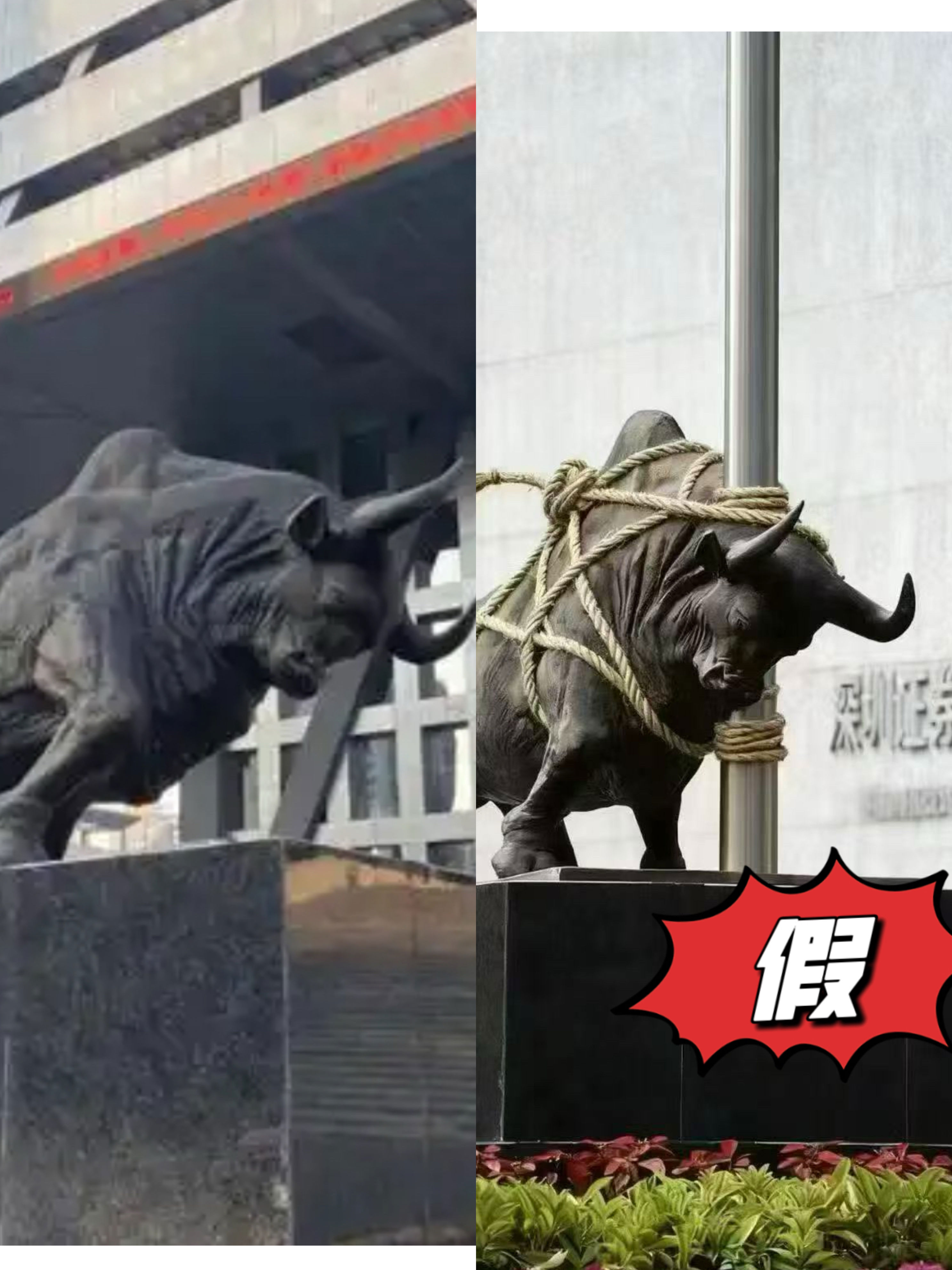 23日,有网民传播的图片显示,深交所门前的牛雕塑被用绳拴在一根柱子上。南方+记者发现,深交所的牛雕塑旁边并没有柱子,其背后也没有深交所的门牌字,相关图片疑似为AI工具制作的。