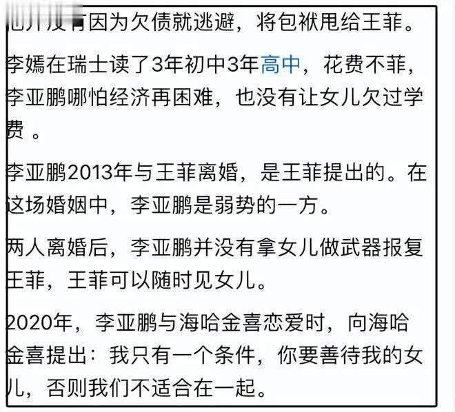 据业内吧奥利奥,离婚是王菲提出的,当时李亚鹏的经济更是已经崩盘了。但离婚后,李嫣在瑞士读了3年初中和高中,李亚鹏没有让女儿欠过学费。离婚后,李亚鹏也没有拿女儿作为威胁王菲的条件,王菲随时可以见女儿。